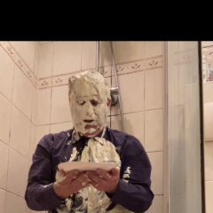 GunkDunk89 was surprised by PreppyGuy with a big sloppy cream pie to the face